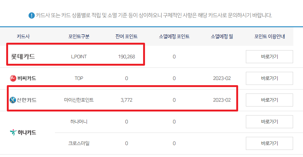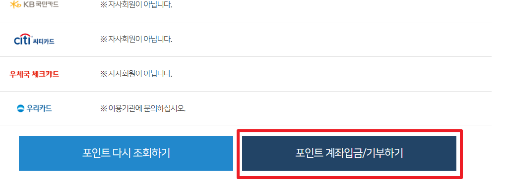 저의 경우 롯데카드에서 무려 19만 포인트가 적립되어 있었고 신한카드에서도 3700원 정도가 적립되어 있습니다. 바로 포인트 계좌입금/기부하기 버튼을 눌러 다음으로 진행해 줍니다.