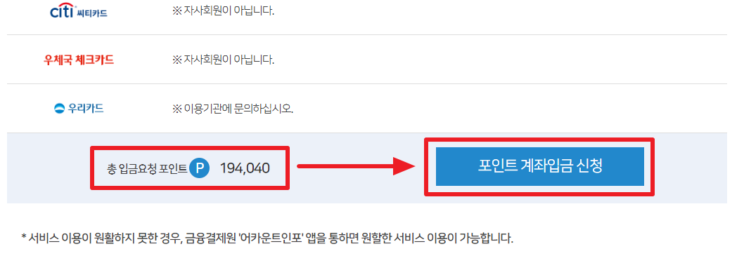 지금까지 카드포인트 통합조회 방법과 현금으로 계좌입금 신청하는 방법까지 알아보았습니다. 관련하여 더 자세한 사항은 여신금융협회에 문의해보시기 바랍니다.