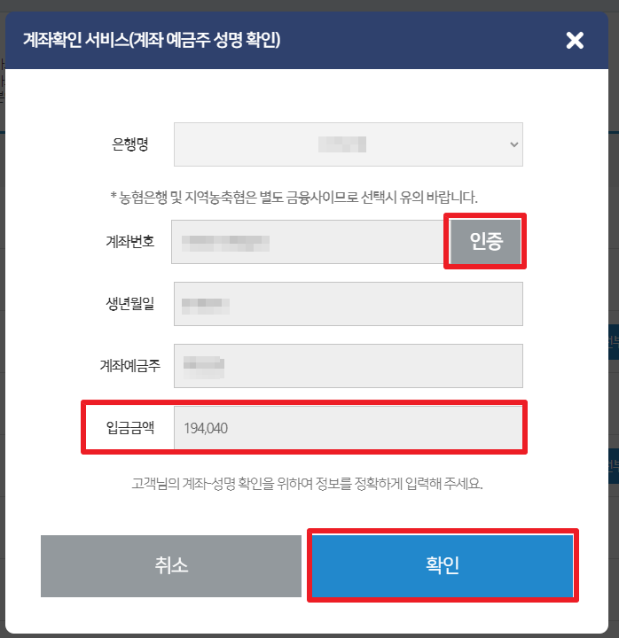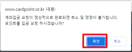 기부를 하실 분은 기부하기를 하면 되고 저는 포인트 계좌입금 신청을 했으므로 아래와 같이 계좌 확인 서비스에서 계좌번호 인증확인을 거치고 입금액을 확인한 다음 확인 버튼을 눌러 줍니다.