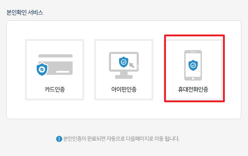 본인 확인을 위해 세 가지 방법 중 하나로 진행하면 되는데 휴대전화 인증을 통해 본인확인을 진행하는 것이 편리합니다.