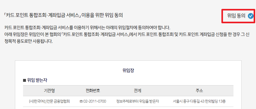 본인 확인이 완료 되면 카드포인트 통합조회를 위한 위임을 동의해야 합니다. 이는 한국여신전문 금융업협회에 위임을 하는 것이므로 안심하시고 진행하시면 됩니다.